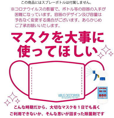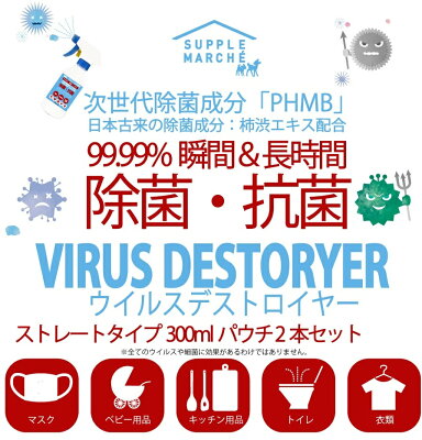 商品詳細 商品名 ウイルスデストロイヤーストレートタイプ スプレー用詰替え用パウチ300ml 2本 ※スプレーボトルは付属しません 原材料名 ポリヘキサメチレンビグアナイド、パンシル(柿渋エキス) 内容量 パウチ300ml2本※スプレーボトルは付属しません ご使用方法 商品裏面をご確認ください。